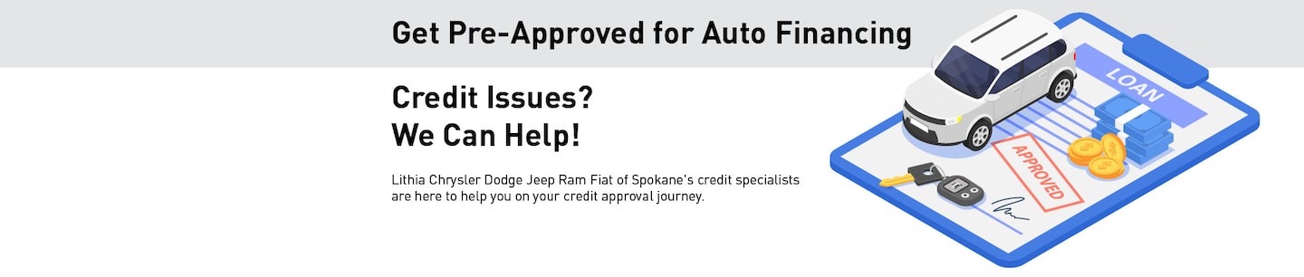 Finding the perfect vehicle and securing auto financing used to take a lot of time and effort, especially if you had no credit or credit issues. Not anymore. Let Lithia Chrysler Dodge Jeep Ram FIAT of Spokane help you build your credit and get pre-approved for the new or used car of your dreams. It's quick, easy, and you can get qualified online.