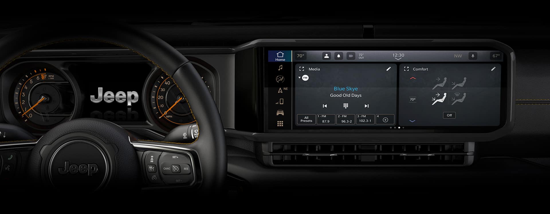 The spacious main cabin of the new Jeep Gladiator is outfitted with great comfort and tech perks. The large 12.3-inch touchscreen is great for those looking for the latest and modern tech. Automatic climate control helps keep the main cabin perfectly tempered, while the leather-wrapped steering wheel provides an added layer of luxury to this rugged vehicle.