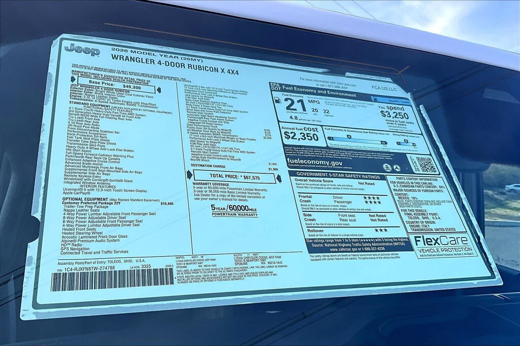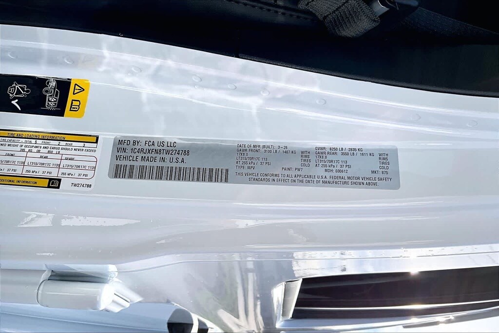 QUICK ORDER PACKAGE 22Y RUBICON X 2.0L I4 DOHC DI Turbo Engine w/ESS, 8-Speed Automatic 850RE Transmission, Blind Spot & Cross Path Detection, Rear View Auto Dim Mirror, Heated Front Seats, Integrated Voice Command w/Bluetooth®, Connected Travel & Traffic Services, Acoustic Front Seat Area Carpet, Heated Steering Wheel, Steel Front Bumper, Integrated Off-Road Camera, HD Radio, Freedom Panel Storage Bag, Rear Window Defroster, Rear Window Wiper/Washer, No Soft Top, Auto High Beam Headlamp Control, Universal Garage Door Opener, Acoustic Laminated Front Door Glass, ParkSense Rear Park Assist System, Trailer Tow Prep Package, Steel Rear Bumper, 8-SPEED AUTOMATIC 850RE TRANSMISSION LT315/70R17C 113/110S Tires, Remote Start System, Wheel Flare Extensions, 4:1 Rock-Trac HD Full Time 4WD System, MOPAR Tire Relocation Kit, Anti-Lock 4-Wheel Disc Perf Brakes, 17 x 8 Machined Wheels w/Black Pockets, 4.56 Rear Axle Ratio, 35 Tire Suspension, MOPAR Hinge-Gate Reinforcement, MOPAR Jack Spacer, Adaptive Cruise Control w/Stop, Selec-Speed Control, 2.0L I4 DOHC DI TURBO ENGINE W/ESS. Jeep Rubicon X with Bright White Clearcoat exterior and Black interior features a 4 Cylinder Engine with 270 HP at 5250 RPM*.