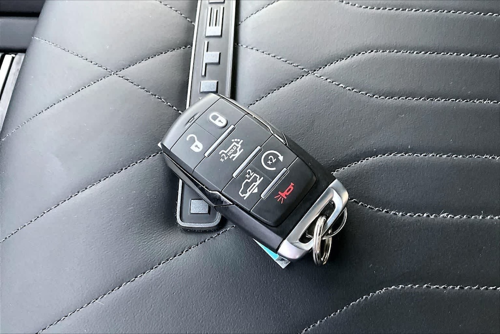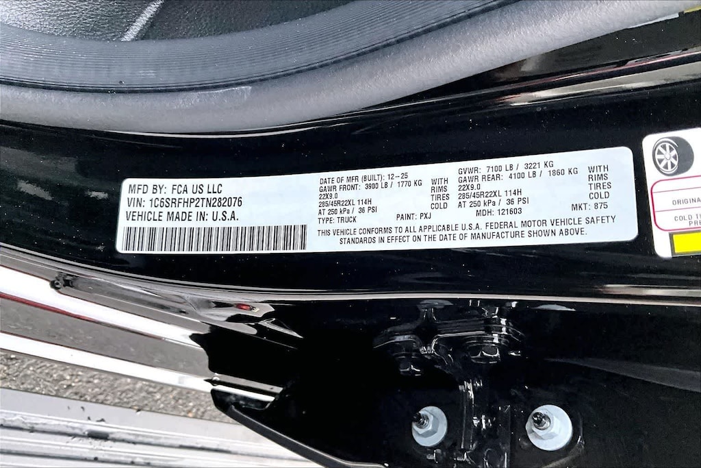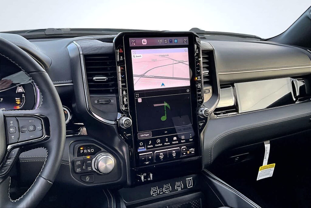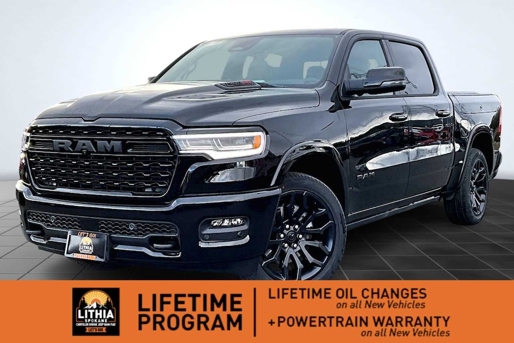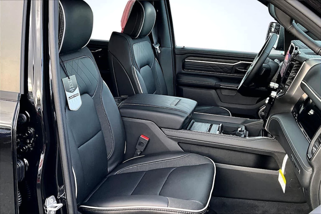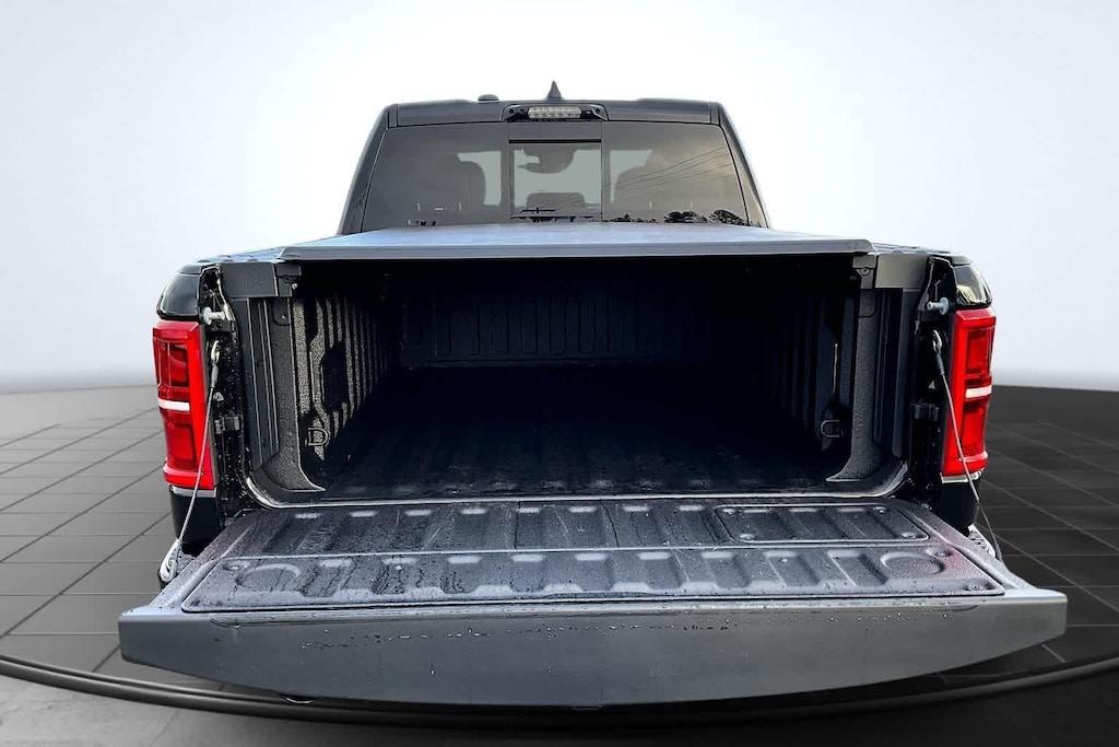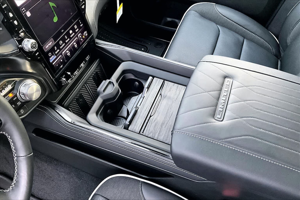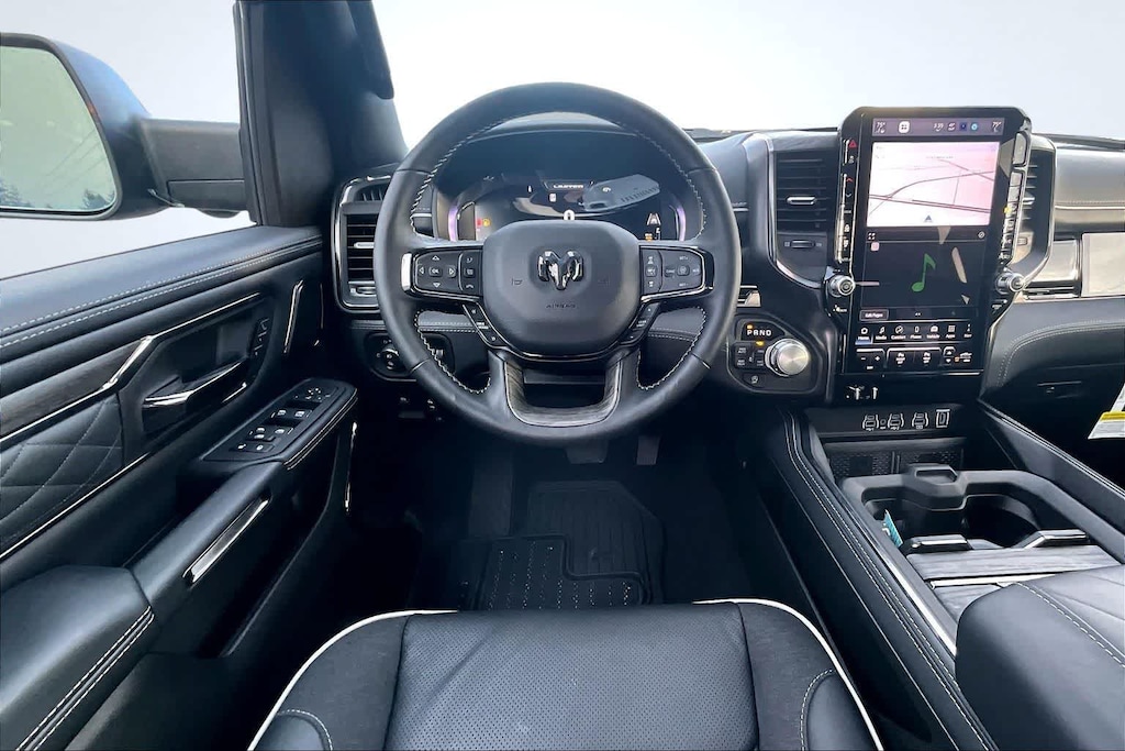 LIMITED LEVEL A EQUIPMENT GROUP Surround View Camera System, LED CHMSL Lamp, Tri-Fold Tonneau Cover, Traffic Sign Recognition, RamBox Cargo Management System, Hands-Free Active Driving Assist System, Head Up Display, Evasive Steer Assist, Drowsy Driver Detection, Exterior 115V AC Outlet, Intersection Collision Assist System, Smartphone As A Key Capable, 14.4 Touchscreen Display, Radio: Uconnect 5 Nav w/14.4 Display, 240 Amp Alternator, 12-Way/1-Way Trailer Connector, NIGHT EDITION Tires: 285/45R22XL BSW All Season, Black Headlamp Bezels, Wheels: 22 x 9 Premium Black Aluminum, Pirelli Brand Tires, Accent Color Door Handles, Body Color Front Bumper, Body Color Rear Bumper w/Step Pads, RAM Grille Badge - Black, Black Painted Exterior Mirrors Caps, Accent Color Premium Power Mirrors, Sport Performance Hood, Black Exterior Truck Badging, Black Day Light Opening Moldings, Accent Color Tailgate Handle, Dual Exhaust w/Black Tips, Black Grille Surround Texture 7 Black, Black Tail Lamp Bezels, DUAL-PANE PANORAMIC SUNROOF LED Dome/Reading Lamp, Dome Dual LED Reading Lamp, TRANSMISSION: 8-SPEED AUTOMATIC (8HP75) (STD). Ram Limited with Diamond Black Crystal Pearlcoat exterior and Black interior features a Straight 6 Cylinder Engine.