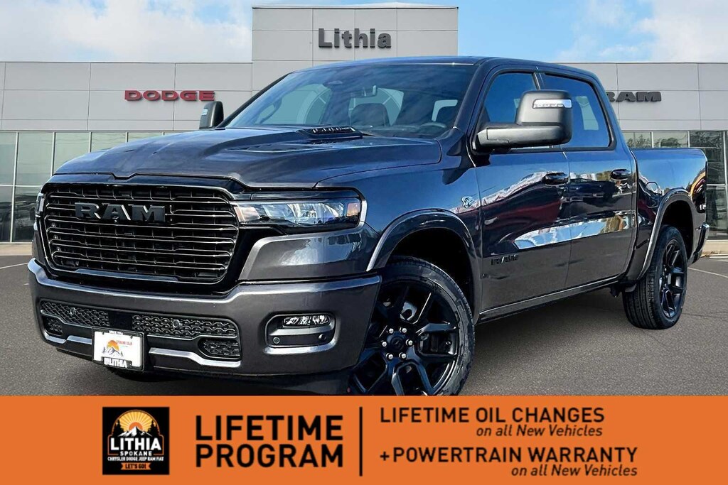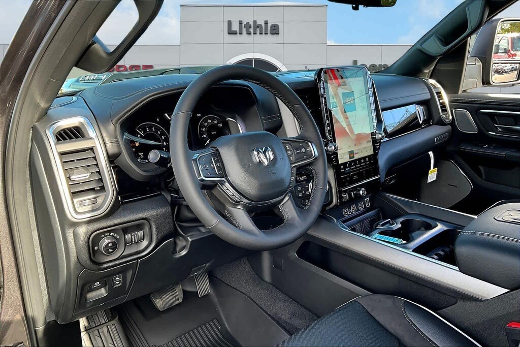 NIGHT EDITION Black Headlamp Bezels, Wheels: 22 x 9 Forged Aluminum, Tires: 285/45R22XL BSW All Season, Pirelli Brand Tires, Proximity Approach/Departure Lamps, Anti-Spin Differential Rear Axle, Accent Color Door Handles, Black Interior Accents, Body Color Front Bumper, Grille Surround 3 Black Texture 2 Black, Body Color Rear Bumper w/Step Pads, RAM Grille Badge - Black, Black Painted Exterior Mirrors Caps, Exterior Mirrors Approach Lamps, Accent Color Premium Power Mirrors, Sport Performance Hood, Black Exterior Truck Badging, Accent Color Tailgate Handle, Dual Exhaust w/Black Tips, Black Tail Lamp Bezels, ADVANCED SAFETY GROUP II Exterior Mirrors Approach Lamps, Active Driving Assist System, Surround View Camera System, Evasive Steer Assist, Drowsy Driver Detection, Intersection Collision Assist System, Traffic Sign Recognition, 12-Way/1-Way Trailer Connector, LARAMIE LEVEL 2 EQUIPMENT GROUP Rain Sensitive Windshield Wipers, Front Passenger Interactive Display, Secondary Active Grille Shutters, Smartphone As A Key Capable, 14.4 Touchscreen Display, Dual Wireless Charging Pad, Radio: Uconnect 5 Nav w/14.4 Display, harman/kardon® 19 Speaker Premium Sound, Cluster 12 TFT Color Display, Power Tailgate, TECHNOLOGY GROUP Head Up Display, LED CHMSL Lamp, 12-Way/1-Way Trailer Connector, MOPAR FRONT & REAR RUBBER FLOOR MATS, TRANSMISSION: 8-SPEED AUTOMATIC (8HP75) (STD), ENGINE: 5.7L V8 HEMI MDS VVT ETORQUE 48V Belt Starter Generator, Heavy Duty Engine Cooling, Passive Tuned Mass Damper, Delete Alternator, Passive Cold End Exhaust, 18 Aluminum Spare Wheel, 33 Gallon Fuel Tank, DUAL-PANE PANORAMIC SUNROOF LED Dome/Reading Lamp, Dome Dual LED Reading Lamp. Ram Laramie with Granite Crystal Metallic Clearcoat exterior and Black interior features a 8 Cylinder Engine with 420 HP at 5200 RPM*.
