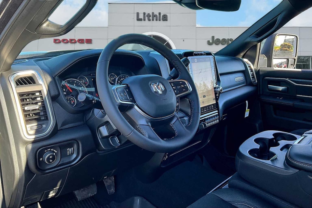 ENGINE: 6.7L I6 CUMMINS HO TURBO DIESEL Selective Catalytic Reduction (Urea), Dual 730 Amp Maintenance Free Batteries, Cummins Turbo Diesel Badge, Heavy Duty Engine Cooling, Diesel Exhaust Brake, Supplemental Heater, 3.42 Axle Ratio, Front Bumper Sight Shields, Capless Fuel Fill w/o Discriminator, GVWR: 11,040 lbs, BIG HORN LEVEL 1 PLUS EQUIPMENT GROUP Emergency Vehicle Alert System (EVAS), 12 Touchscreen Display, Glove Box Lamp, Auto Power-Folding Mirrors, Footwell Courtesy Lamp, Anti-Spin Differential Rear Axle, MOPAR Deployable Bed Step, Alexa Built-In, Forward & Reverse Utility Lights, Locking Lower Glove Box, Remote Start System, 9 Alpine Speakers w/Subwoofer, Disassociated Touchscreen Display, Dual Glove Boxes, 2nd Row In Floor Storage Bins, Rear View Auto Dim Mirror, Rear Dome w/On/Off Switch Lamp, LED Bed Lighting, GPS Navigation, SiriusXM w/360L, Connected Travel & Traffic Services, Foam Bottle Insert (Door Trim Panel), Big Horn IP Badge, Off-Road Info Pages, Trailer Tow Pages, HD Radio, Radio: Uconnect 5 Nav w/12.0 Display, Power Heated Folding Telescopic Mirrors, Steering Wheel Mounted, TOWING TECHNOLOGY GROUP CTR Stop Lamp w/Cargo View Camera, Surround View Camera System, Trailer Tire Pressure Monitoring System, Blind Spot & Cross Path Detection, LED Tail Lamps, Red Tail Lamp Bezels, Trailer Reverse Guidance, HEATED SEATS & WHEEL GROUP Heated Steering Wheel, Heated Front Seats, MOPAR FRONT & REAR RUBBER FLOOR MATS, TRANSMISSION: 8-SPEED TORQUEFLITE HD AUTOMATIC, BLACK, PREMIUM CLOTH 40/20/40 BENCH SEAT Rear 60/40 Folding Seat, Front Center Seat Cushion Storage, Power Adjust 8-Way Driver Seat, Folding Flat Load Floor Storage, Front Seat Back Map Pockets, Power 2-Way Driver Lumbar Adjust. Ram Big Horn with Granite Crystal Metallic Clearcoat exterior and Black interior features a Straight 6 Cylinder Engine with 430 HP at 2800 RPM*.