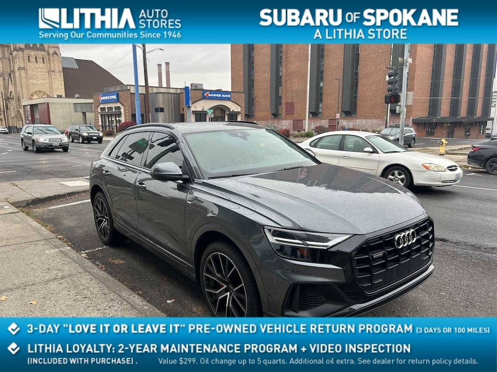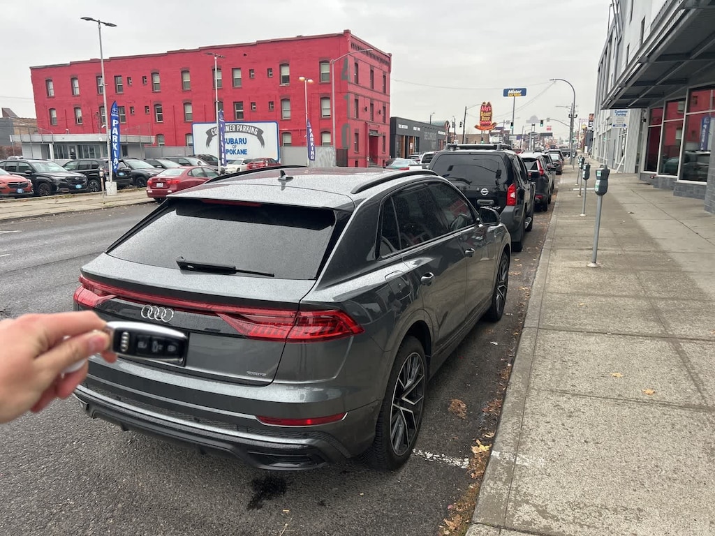 Clean CARFAX. Samurai Gray Metallic 2020 Audi Q8 55 Premium Plus quattro quattro 8-Speed Automatic with Tiptronic 3.0L V6 Turbocharged DOHC 24V LEV3-ULEV125 335hp 10 Speakers, 4-Wheel Disc Brakes, ABS brakes, Adaptive suspension, Air Conditioning, Alloy wheels, AM/FM radio: SiriusXM, Audi smartphone interface (Apple CarPlay/Android Auto), Auto High-beam Headlights, Auto-dimming Rear-View mirror, Automatic temperature control, Axle Ratio: TBA, Brake assist, Bumpers: body-color, Compass, Delay-off headlights, Driver door bin, Driver vanity mirror, Dual front impact airbags, Dual front side impact airbags, Electronic Stability Control, Emergency communication system: Audi connect CARE, PRIME & PLUS, Exterior Parking Camera Rear, Four wheel independent suspension, Front anti-roll bar, Front Bucket Seats, Front Center Armrest, Front dual zone A/C, Front fog lights, Front reading lights, Fully automatic headlights, Garage door transmitter: HomeLink, Genuine wood door panel insert, Heated door mirrors, Heated Front Bucket Seats, Heated front seats, Illuminated entry, Leather Seating Surfaces, Leather Shift Knob, Leather steering wheel, Low tire pressure warning, Memory seat, Navigation System, Occupant sensing airbag, Outside temperature display, Overhead airbag, Overhead console, Panic alarm, Passenger door bin, Passenger vanity mirror, Power door mirrors, Power driver seat, Power Liftgate, Power moonroof, Power passenger seat, Power steering, Power windows, Radio data system, Radio: Audi MMI Navigation Plus w/Touch Response, Rain sensing wipers, Rear air conditioning, Rear anti-roll bar, Rear fog lights, Rear reading lights, Rear seat center armrest, Rear window defroster, Rear window wiper, Remote keyless entry, Roof rack: rails only, Security system, Speed control, Speed-sensing steering, Split folding rear seat, Spoiler, Steering wheel memory, Steering wheel mounted audio controls, Tachometer, Telescoping steering wheel, Tilt steering wheel, Traction control, Trip computer, Turn signal indicator mirrors, Variably intermittent wipers, Wheels: 20 5-Arm Design.