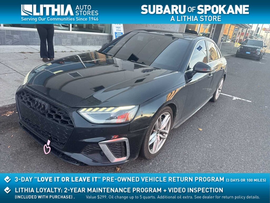2022 Audi A4 45 S line Premium Plus quattro quattro 7-Speed Automatic S tronic 2.0L TFSI 7-Speed Automatic S tronic, quattro, Leather, 10 Speakers, 4-Wheel Disc Brakes, ABS brakes, Air Conditioning, Alloy wheels, AM/FM radio, Anti-whiplash front head restraints, Audi smartphone interface (Apple CarPlay/Android Auto), Auto High-beam Headlights, Auto-dimming Rear-View mirror, Automatic temperature control, Brake assist, Bumpers: body-color, Compass, Delay-off headlights, Driver door bin, Driver vanity mirror, Dual front impact airbags, Dual front side impact airbags, Electronic Stability Control, Emergency communication system: Audi connect CARE, Exterior Parking Camera Rear, Four wheel independent suspension, Front anti-roll bar, Front Bucket Seats, Front Center Armrest, Front dual zone A/C, Front fog lights, Front reading lights, Garage door transmitter: HomeLink, Genuine wood dashboard insert, Genuine wood door panel insert, Heated door mirrors, Heated front seats, Heated Front Sport Bucket Seats, Illuminated entry, Knee airbag, Leather Seating Surfaces, Leather Shift Knob, Leather steering wheel, Low tire pressure warning, Occupant sensing airbag, Outside temperature display, Overhead airbag, Overhead console, Panic alarm, Passenger door bin, Passenger vanity mirror, Power door mirrors, Power driver seat, Power moonroof, Power passenger seat, Power steering, Power windows, Radio data system, Radio: Audi Sound System, Rain sensing wipers, Rear air conditioning, Rear anti-roll bar, Rear reading lights, Rear seat center armrest, Rear window defroster, Remote keyless entry, Speed control, Speed-sensing steering, Speed-Sensitive Wipers, Split folding rear seat, Steering wheel mounted audio controls, Tachometer, Telescoping steering wheel, Tilt steering wheel, Traction control, Trip computer, Turn signal indicator mirrors, Variably intermittent wipers, Wheels: 18 5-Double-Spoke Design, 7-Speed Automatic S tronic, quattro, Leather.