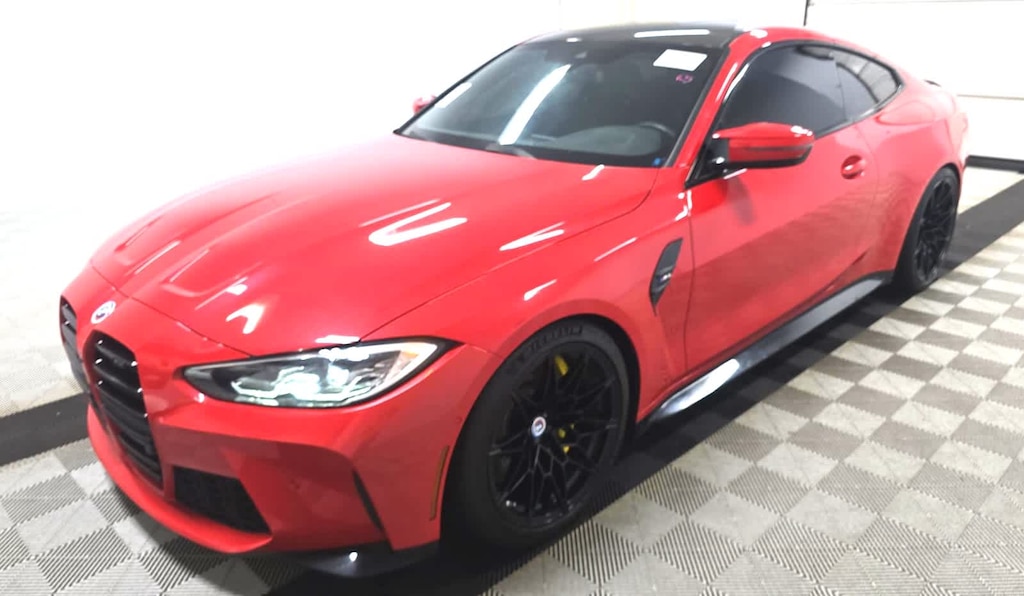 Clean CARFAX. Red Metallic 2023 BMW M4 RWD 6-Speed Manual 3.0L I6 Turbocharged DOHC 24V LEV3-ULEV70 473hp 16 Speakers, 4-Wheel Disc Brakes, ABS brakes, Adaptive suspension, Air Conditioning, Alloy wheels, AM/FM radio: SiriusXM, Apple CarPlay & Android Auto Compatibility, Auto High-beam Headlights, Auto-dimming door mirrors, Auto-dimming Rear-View mirror, Automatic temperature control, BMW Assist eCall, BMW TeleServices, Brake assist, Bumpers: body-color, Carbon Fiber Trim, Compass, ConnectedDrive Services, Delay-off headlights, Driver door bin, Driver vanity mirror, Dual front impact airbags, Dual front side impact airbags, Electronic Stability Control, Emergency communication system: BMW Assist eCall, Enhanced USB/Bluetooth Plus Smartphone Integration, Extended Merino Leather Upholstery, Exterior Parking Camera Rear, Four wheel independent suspension, Front anti-roll bar, Front Bucket Seats, Front Center Armrest, Front dual zone A/C, Front reading lights, Fully automatic headlights, Garage door transmitter, harman/kardon Surround Sound System, harman/kardonî Speakers, Heated door mirrors, Heated Front Seats, Heated front seats, Illuminated entry, Knee airbag, Leather Shift Knob, Live Cockpit Pro w/Navi, Low tire pressure warning, Lumbar Support, M Sport Seats, Memory seat, Navigation System, Occupant sensing airbag, Outside temperature display, Overhead airbag, Overhead console, Panic alarm, Parking Assistant Plus, Passenger door bin, Passenger vanity mirror, Power door mirrors, Power driver seat, Power Front Seats, Power passenger seat, Power steering, Power windows, Radio data system, Radio: AM/FM Audio System, Rain sensing wipers, Rear air conditioning, Rear anti-roll bar, Rear reading lights, Rear seat center armrest, Rear window defroster, Remote keyless entry, Security system, SiriusXM Satellite Radio, Speed control, Speed-sensing steering, Speed-Sensitive Wipers, Split folding rear seat, Spoiler, Sport steering wheel, Steering wheel mounted audio controls, Tachometer, Telescoping steering wheel, Tilt steering wheel, Traction control, Trip computer, Turn signal indicator mirrors, Variably intermittent wipers, Wheels: 18 x 9.5 Fr/19 x 10.5 Rr M Double-Spk, Wheels: 19 x 9.5 Fr/20 x 10.5 Rr Silver.