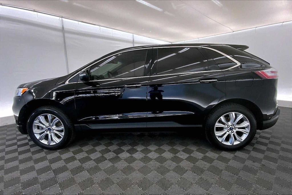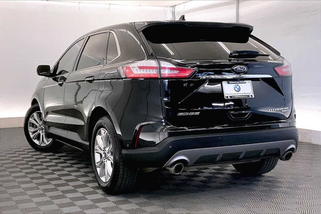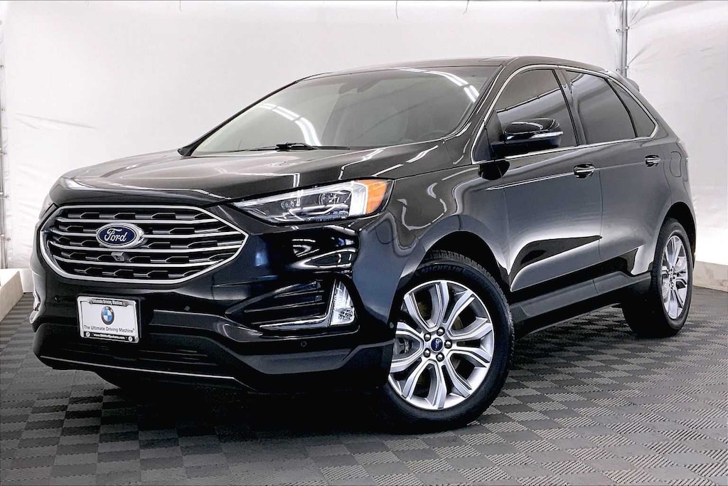 Clean CARFAX. Black Metallic 2019 Ford Edge Titanium AWD 8-Speed Automatic EcoBoost 2.0L I4 GTDi DOHC Turbocharged VCT AWD, 12 Speakers, 4-Wheel Disc Brakes, ABS brakes, Adaptive Cruise Control w/Stop & Go, Adaptive LED Headlamps, Air Conditioning, Alloy wheels, AM/FM radio: SiriusXM, AppLink/Apple CarPlay and Android Auto, Auto High-beam Headlights, Auto tilt-away steering wheel, Auto-Dimming Drivers Sideview Mirror, Auto-dimming Rear-View mirror, Automatic temperature control, Axle Ratio: TBA, Brake assist, Bumpers: body-color, CD player, Compass, Delay-off headlights, Driver door bin, Driver vanity mirror, Dual front impact airbags, Dual front side impact airbags, Electronic Stability Control, Emergency communication system: SYNC 3 911 Assist, Enhanced Active Park Assist, Equipment Group 301A, Evasive Steering Assist, Four wheel independent suspension, Front 180 Degree Camera, Front anti-roll bar, Front Bucket Seats, Front Center Armrest w/Storage, Front dual zone A/C, Front fog lights, Front reading lights, Fully automatic headlights, Garage door transmitter, Heated door mirrors, Heated front seats, Heated Rear-Seats, Illuminated entry, Knee airbag, Leather Trimmed Heated/Cooled Bucket Seats, Leather-Trimmed Heated Sport Bucket Seats, Low tire pressure warning, Memory seat, Occupant sensing airbag, Outside temperature display, Overhead airbag, Overhead console, Panic alarm, Panoramic Vista Roof, Passenger door bin, Passenger vanity mirror, Power door mirrors, Power driver seat, Power Liftgate, Power passenger seat, Power steering, Power windows, Radio: B&O Sound System by Bang & Olufsen, Rain sensing wipers, Rear anti-roll bar, Rear Parking Sensors, Rear reading lights, Rear seat center armrest, Rear window defroster, Rear window wiper, Remote keyless entry, Roof rack: rails only, Security system, SiriusXM Radio, SiriusXM Traffic & Travel Link, Speed control, Speed-Sensitive Wipers, Split folding rear seat, Spoiler, Steering wheel memory, Steering wheel mounted audio controls, SYNC 3 Communications & Entertainment System, Tachometer, Telescoping steering wheel, Tilt steering wheel, Traction control, Trip computer, Turn signal indicator mirrors, Variably intermittent wipers, Voice-Activated Touchscreen Navigation System, Wheels: 19 Nickel-Painted Aluminum, AWD.