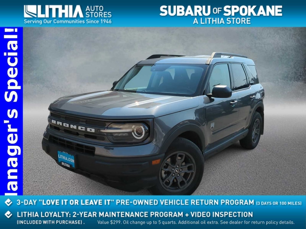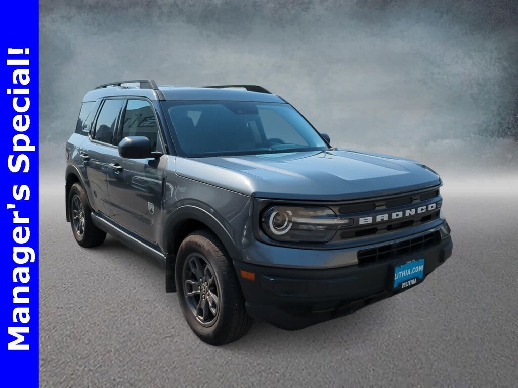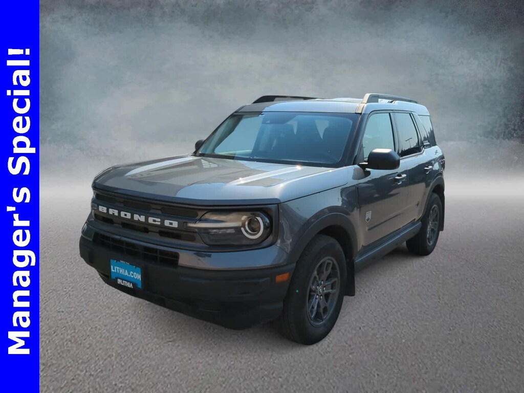 CARFAX One-Owner. Carbonized Gray Metallic 2022 Ford Bronco Sport Big Bend 4WD 8-Speed Automatic 1.5L EcoBoost 3.80 Axle Ratio, 4-Wheel Disc Brakes, 6 Speakers, ABS brakes, Air Conditioning, Alloy wheels, AM/FM radio: SiriusXM, AM/FM Stereo, Auto High-beam Headlights, Automatic temperature control, Brake assist, Cargo Mat, Compass, Delay-off headlights, Driver door bin, Driver vanity mirror, Dual front impact airbags, Dual front side impact airbags, Electronic Stability Control, Emergency communication system: SYNC 3 911 Assist, Engine Block Heater, Equipment Group 200A, Four wheel independent suspension, Front & Rear Floor Liners, Front anti-roll bar, Front Bucket Seats, Front Center Armrest, Front reading lights, Fully automatic headlights, Heated door mirrors, Illuminated entry, Knee airbag, Low tire pressure warning, Occupant sensing airbag, Outside temperature display, Overhead airbag, Overhead console, Panic alarm, Passenger door bin, Passenger vanity mirror, Power door mirrors, Power steering, Power windows, Radio data system, Rear anti-roll bar, Rear reading lights, Rear seat center armrest, Rear window defroster, Rear window wiper, Remote keyless entry, Roof rack: rails only, Rubberized Second Row Seat Backs, Security system, SiriusXM Radio, Speed control, Speed-sensing steering, Speed-Sensitive Wipers, Split folding rear seat, Steering wheel mounted audio controls, SYNC 3 Communications & Entertainment System, SYNC 3/Apple CarPlay/Android Auto, Tachometer, Telescoping steering wheel, Tilt steering wheel, Traction control, Trip computer, Unique Cloth Front Bucket Seats, Variably intermittent wipers, Wheels: 17 Carbonized Gray-Painted Aluminum.