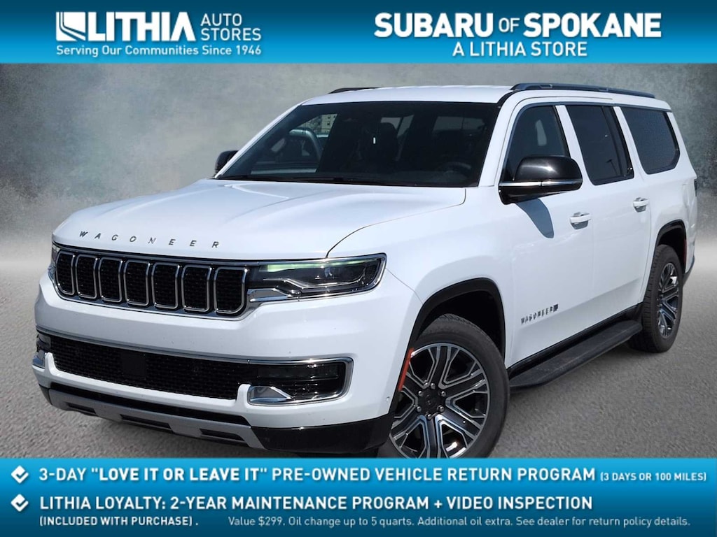 CARFAX One-Owner. Bright White Clearcoat 2023 Jeep Wagoneer L Series II 4WD 8-Speed Automatic 3.0L I6 10 Speakers, 3.55 Rear Axle Ratio, 3rd row seats: bench, 4-Wheel Disc Brakes, ABS brakes, Adjustable pedals, Air Conditioning, Alloy wheels, AM/FM radio: SiriusXM with 360L, Anti-whiplash front head restraints, Audio memory, Auto-dimming door mirrors, Auto-dimming Rear-View mirror, Auto-leveling suspension, Automatic temperature control, Brake assist, Bumpers: body-color, Compass, Delay-off headlights, Driver door bin, Driver vanity mirror, Drivers Seat Mounted Armrest, Dual front impact airbags, Dual front side impact airbags, Electronic Stability Control, Emergency communication system: Automatic SOS Call, Exterior Parking Camera Rear, Four wheel independent suspension, Front anti-roll bar, Front Bucket Seats, Front Center Armrest w/Storage, Front dual zone A/C, Front fog lights, Front reading lights, Fully automatic headlights, Garage door transmitter, Genuine wood console insert, Genuine wood dashboard insert, Genuine wood door panel insert, Heated door mirrors, Heated front seats, Heated steering wheel, Illuminated entry, Knee airbag, Leather Trimmed Bucket Seats, Low tire pressure warning, Memory seat, Navigation System, Normal Duty Suspension, Occupant sensing airbag, Outside temperature display, Overhead airbag, Overhead console, Panic alarm, Passenger door bin, Passenger seat mounted armrest, Passenger vanity mirror, Pedal memory, Power adjustable front head restraints, Power door mirrors, Power driver seat, Power Liftgate, Power passenger seat, Power steering, Power windows, Radio data system, Radio: Uconnect 5 Nav w/10.1 Display, Rain sensing wipers, Rear air conditioning, Rear anti-roll bar, Rear reading lights, Rear seat center armrest, Rear window defroster, Rear window wiper, Reclining 3rd row seat, Remote keyless entry, Security system, Speed control, Speed-sensing steering, Speed-Sensitive Wipers, Split folding rear seat, Steering wheel memory, Steering wheel mounted audio controls, Tachometer, Telescoping steering wheel, Tilt steering wheel, Traction control, Trip computer, Turn signal indicator mirrors, Variably intermittent wipers, Ventilated front seats, Voltmeter, Wheels: 20 x 9.0 Premium 2 Aluminum.