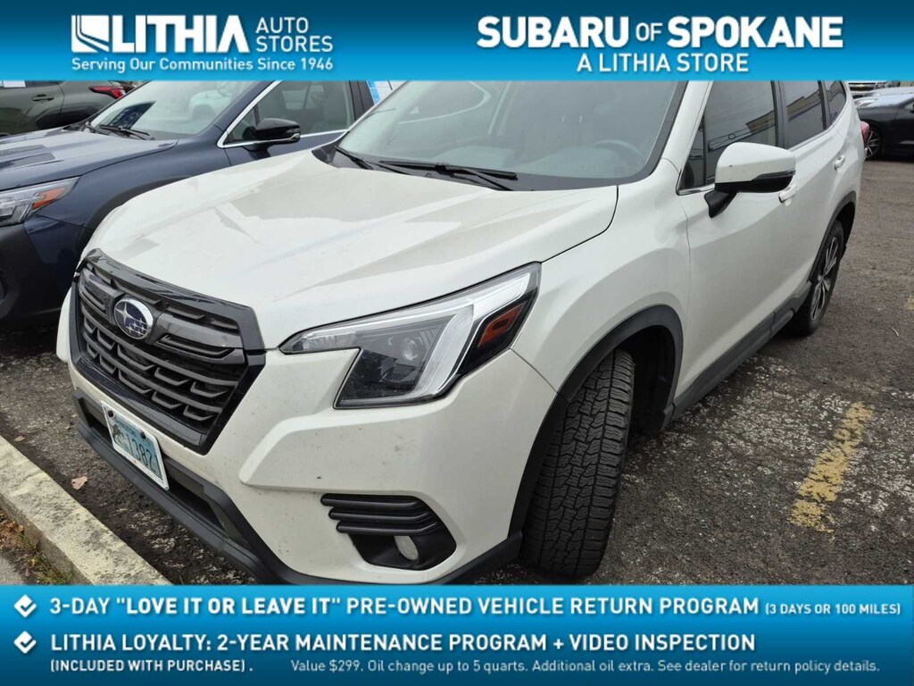 Clean CARFAX. Crystal White Pearl 2022 Subaru Forester Limited AWD Lineartronic CVT 2.5L 4-Cylinder DOHC 16V 3.70 Axle Ratio, 4-Wheel Disc Brakes, 6 Speakers, ABS brakes, Air Conditioning, All-Weather Floor Liners, Alloy wheels, AM/FM radio: SiriusXM, Anti-whiplash front head restraints, Auto High-beam Headlights, Auto-Dimming Exterior Mirror w/Approach Lighting, Auto-Dimming Mirror w/Compass & HomeLink, Automatic temperature control, Brake assist, Bumpers: body-color, CD player, Driver door bin, Driver vanity mirror, Dual front impact airbags, Dual front side impact airbags, Electronic Stability Control, Emergency communication system: STARLINK Safety and Security (Subscription Required), Exterior Parking Camera Rear, Four wheel independent suspension, Front anti-roll bar, Front Bucket Seats, Front Center Armrest, Front dual zone A/C, Front fog lights, Front reading lights, Fully automatic headlights, harman/kardon 576W Amp & Speaker System, Heated door mirrors, Heated Front Bucket Seats, Heated front seats, Heated Steering Wheel, Illuminated entry, Knee airbag, Leather Shift Knob, Low tire pressure warning, Nav & harman/kardon & RAB & Heated Steering Wheel, Navigation System, Occupant sensing airbag, Outside temperature display, Overhead airbag, Overhead console, Panic alarm, Passenger door bin, Passenger vanity mirror, Perforated Leather-Trimmed Upholstery, Popular Package #3, Power door mirrors, Power driver seat, Power Liftgate, Power moonroof: Panoramic, Power steering, Power windows, Radio data system, Radio: Subaru Starlink 8.0 Multimedia Nav System, Radio: Subaru Starlink 8.0 Multimedia Plus System, Rear anti-roll bar, Rear Bumper Cover, Rear seat center armrest, Rear Seatback Protector, Rear window defroster, Rear window wiper, Remote keyless entry, Reverse Automatic Braking System (RAB), Roof rack: rails only, Security system, Speed control, Speed-sensing steering, Split folding rear seat, Spoiler, STARLINK/Apple CarPlay/Android Auto, Steering wheel mounted audio controls, Tachometer, Telescoping steering wheel, Tilt steering wheel, Traction control, Trip computer, Turn signal indicator mirrors, Variably intermittent wipers, Wheels: 18 x 7.0J Black Machine Finish Alum Alloy.