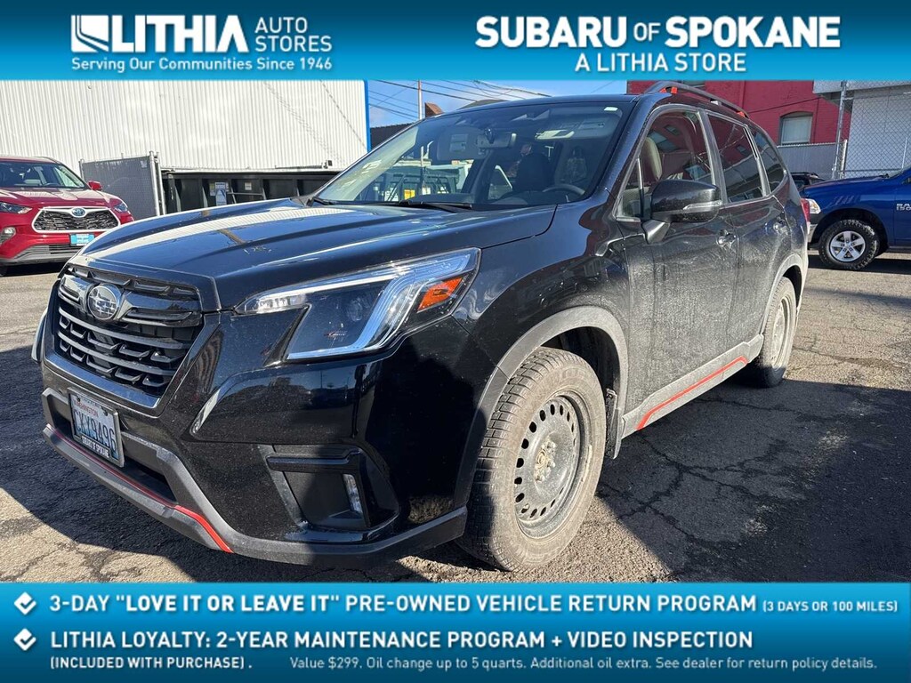 Clean CARFAX. Crystal Black Silica 2023 Subaru Forester Sport AWD Lineartronic CVT 2.5L 4-Cylinder DOHC 16V 3.70 Axle Ratio, 4-Wheel Disc Brakes, 6 Speakers, 8 Audio w/harman/kardon & RAB & Power Rear Gate, ABS brakes, Air Conditioning, All-Weather Floor Liners, Alloy wheels, AM/FM radio: SiriusXM, Anti-whiplash front head restraints, Auto High-beam Headlights, Auto-Dimming Mirror w/Compass & HomeLink, Automatic temperature control, Brake assist, Bumpers: body-color, CD player, Driver door bin, Driver vanity mirror, Dual front impact airbags, Dual front side impact airbags, Electronic Stability Control, Emergency communication system: STARLINK Safety and Security (Subscription Required), Exterior Parking Camera Rear, Four wheel independent suspension, Front anti-roll bar, Front Bucket Seats, Front Center Armrest, Front fog lights, Front reading lights, Fully automatic headlights, harman/kardon 9-Speaker Audio System, Heated door mirrors, Heated Front Bucket Seats, Heated front seats, Illuminated entry, Knee airbag, Leather Shift Knob, Low tire pressure warning, Occupant sensing airbag, Outside temperature display, Overhead airbag, Overhead console, Panic alarm, Passenger door bin, Passenger vanity mirror, Power door mirrors, Power driver seat, Power moonroof: Panoramic, Power Rear Gate, Power steering, Power windows, Radio data system, Radio: Subaru Starlink 6.5 Multimedia Plus System, Radio: Subaru Starlink 8.0 Multimedia Plus System, Rear anti-roll bar, Rear Bumper Cover, Rear seat center armrest, Rear window defroster, Rear window wiper, Remote keyless entry, Reverse Automatic Braking System (RAB), Roof rack: rails only, Security system, Speed control, Speed-sensing steering, Splash Guards, Split folding rear seat, Spoiler, Sport Cloth Upholstery, STARLINK/Apple CarPlay/Android Auto, Steering wheel mounted audio controls, Tachometer, Telescoping steering wheel, Tilt steering wheel, Traction control, Trip computer, Turn signal indicator mirrors, Variably intermittent wipers, Wheels: 18 x 7.0 J Black Finish Aluminum-Alloy.