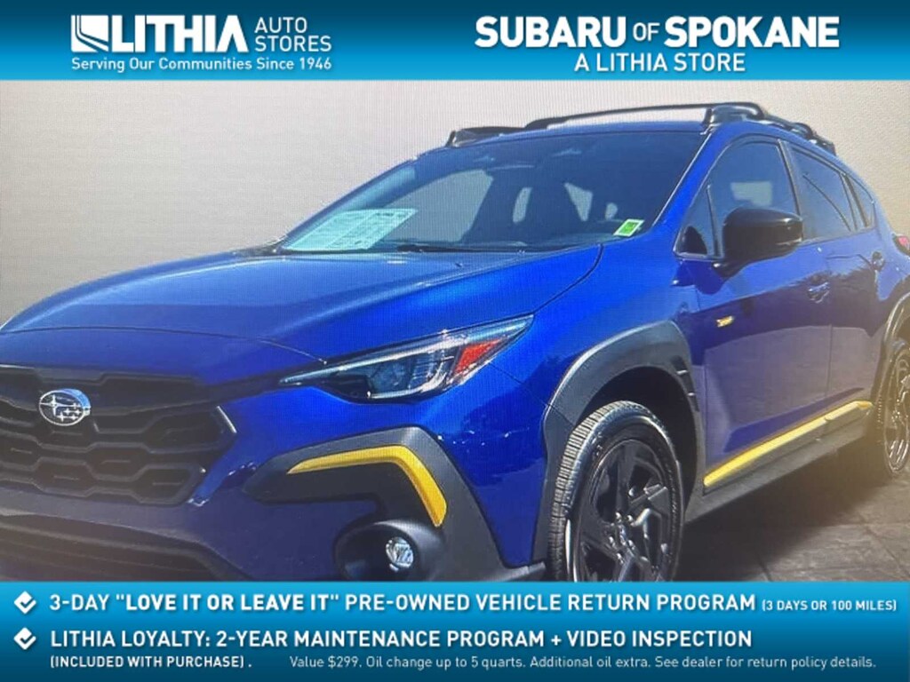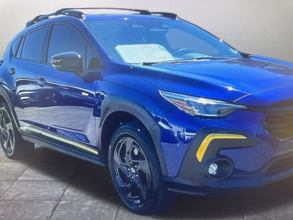 Clean CARFAX. Sapphire Blue Pearl 2024 Subaru Crosstrek Sport AWD Lineartronic CVT 2.5L 4-Cylinder DOHC 16V 10-Way Power Drivers Seat, 3.70 Axle Ratio, 4-Wheel Disc Brakes, 6 Speakers, ABS brakes, Aero Crossbar Set, Air Conditioning, Alloy wheels, AM/FM radio: SiriusXM, Anti-whiplash front head restraints, Auto High-beam Headlights, Automatic temperature control, Blind Spot Detection w/Rear Cross-Traffic Alert, Brake assist, BSD/RCTA & Power Driver Seat & Power Moonroof, Bumpers: body-color, Driver door bin, Driver vanity mirror, Dual front impact airbags, Dual front side impact airbags, Electronic Stability Control, Emergency communication system: STARLINK Safety and Security (Subscription Required), Exterior Parking Camera Rear, Four wheel independent suspension, Front anti-roll bar, Front Bucket Seats, Front Center Armrest, Front dual zone A/C, Front fog lights, Front reading lights, Fully automatic headlights, Heated door mirrors, Heated Front Bucket Seats, Heated front seats, Illuminated entry, Knee airbag, Leather Shift Knob, LED Upgrade, Low tire pressure warning, Occupant sensing airbag, Outside temperature display, Overhead airbag, Overhead console, Panic alarm, Passenger door bin, Passenger vanity mirror, Power door mirrors, Power Moonroof, Power steering, Power windows, Radio data system, Radio: Subaru STARLINK 11.6 Multimedia Plus Sys, Rear anti-roll bar, Rear Bumper Cover, Rear seat center armrest, Rear Seatback Protector, Rear window defroster, Rear window wiper, Remote keyless entry, Security system, Speed control, Speed-sensing steering, Split folding rear seat, Spoiler, Sport Cloth Upholstery, STARLINK/Apple CarPlay/Android Auto, Steering wheel mounted audio controls, Sunshade - Windshield, Tachometer, Telescoping steering wheel, Tilt steering wheel, Traction control, Trip computer, Turn signal indicator mirrors, Variably intermittent wipers, Wheels: 18 x 7.0J Dark Gray Aluminum Alloy.