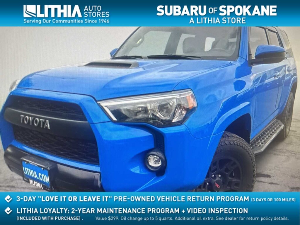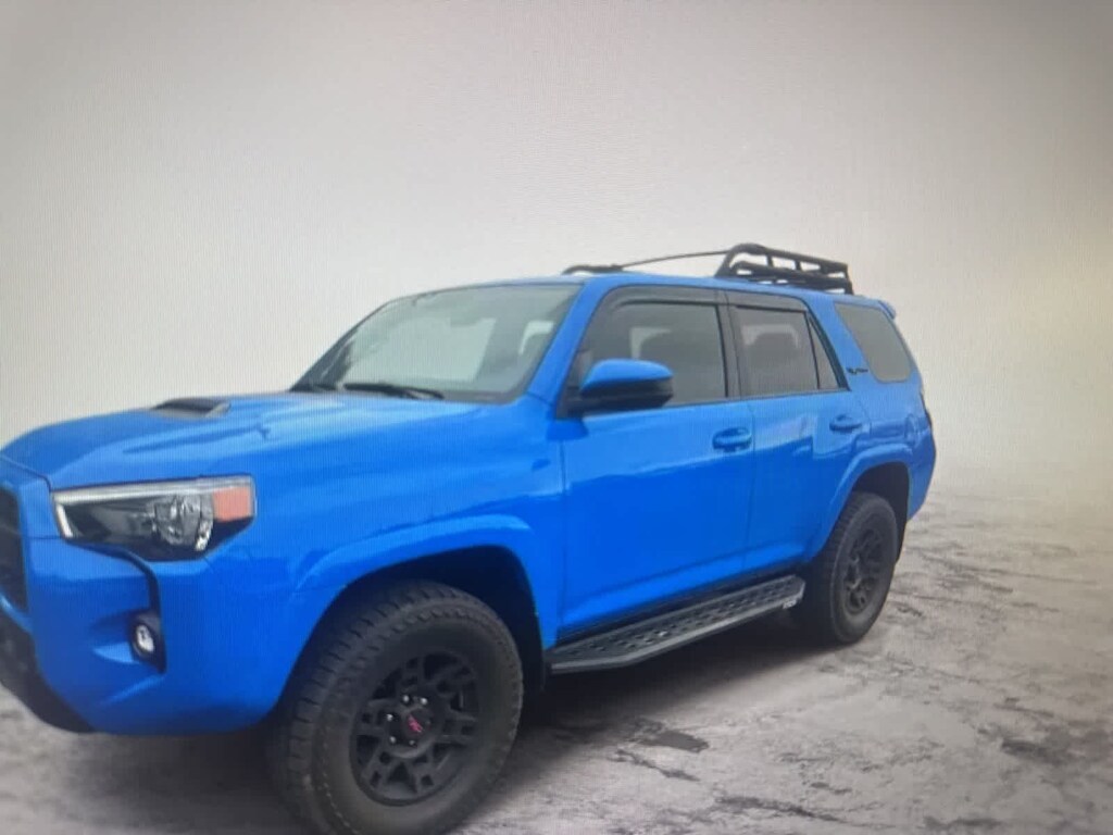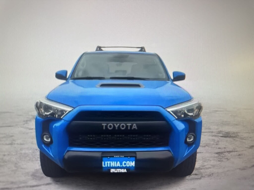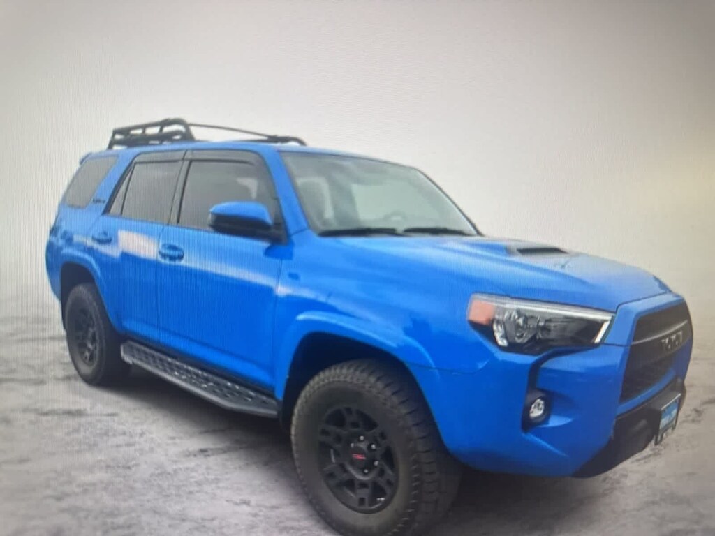 Blue 2019 Toyota 4Runner TRD Pro 4WD 5-Speed Automatic with Overdrive 4.0L V6 SMPI DOHC 4WD, Black Graphite Leather, 3.727 Axle Ratio, 4-Wheel Disc Brakes, 8 Speakers, ABS brakes, Air Conditioning, Alloy wheels, AM/FM radio: SiriusXM, Anti-whiplash front head restraints, Auto-Dimming Rear-View Mirror, Auto-dimming Rear-View mirror, Brake assist, Bumpers: body-color, CD player, Compass, Driver door bin, Driver vanity mirror, Dual front impact airbags, Dual front side impact airbags, Electronic Stability Control, Emergency communication system: Safety Connect, Exterior Parking Camera Rear, Front anti-roll bar, Front Bucket Seats, Front Center Armrest, Front fog lights, Front reading lights, Front wheel independent suspension, Garage Door Opener, Garage door transmitter: HomeLink, Heated door mirrors, Heated Front Bucket Seats, Heated front seats, Illuminated entry, Knee airbag, Leather Shift Knob, Low tire pressure warning, Navigation System, Occupant sensing airbag, Outside temperature display, Overhead airbag, Overhead console, Panic alarm, Passenger door bin, Passenger vanity mirror, Power door mirrors, Power driver seat, Power moonroof, Power passenger seat, Power steering, Power Tilt & Slide Moonroof w/Sunshade, Power windows, Radio: Entune Premium Audio w/Navigation, Rear anti-roll bar, Rear seat center armrest, Rear window defroster, Rear window wiper, Remote keyless entry, Roof rack, Security system, Softex Synthetic Leather Seat Trim, Speed control, Speed-sensing steering, Split folding rear seat, Spoiler, Steering wheel mounted audio controls, Tachometer, Telescoping steering wheel, Tilt steering wheel, Traction control, TRD Badging, TRD Pro Floor Mats, TRD Pro Shift Knob, TRD Suspension Kit, Trip computer, Turn signal indicator mirrors, Variably intermittent wipers, Wheels: TRD 17 Matte Black Alloy, 4WD, Black Graphite Leather.
